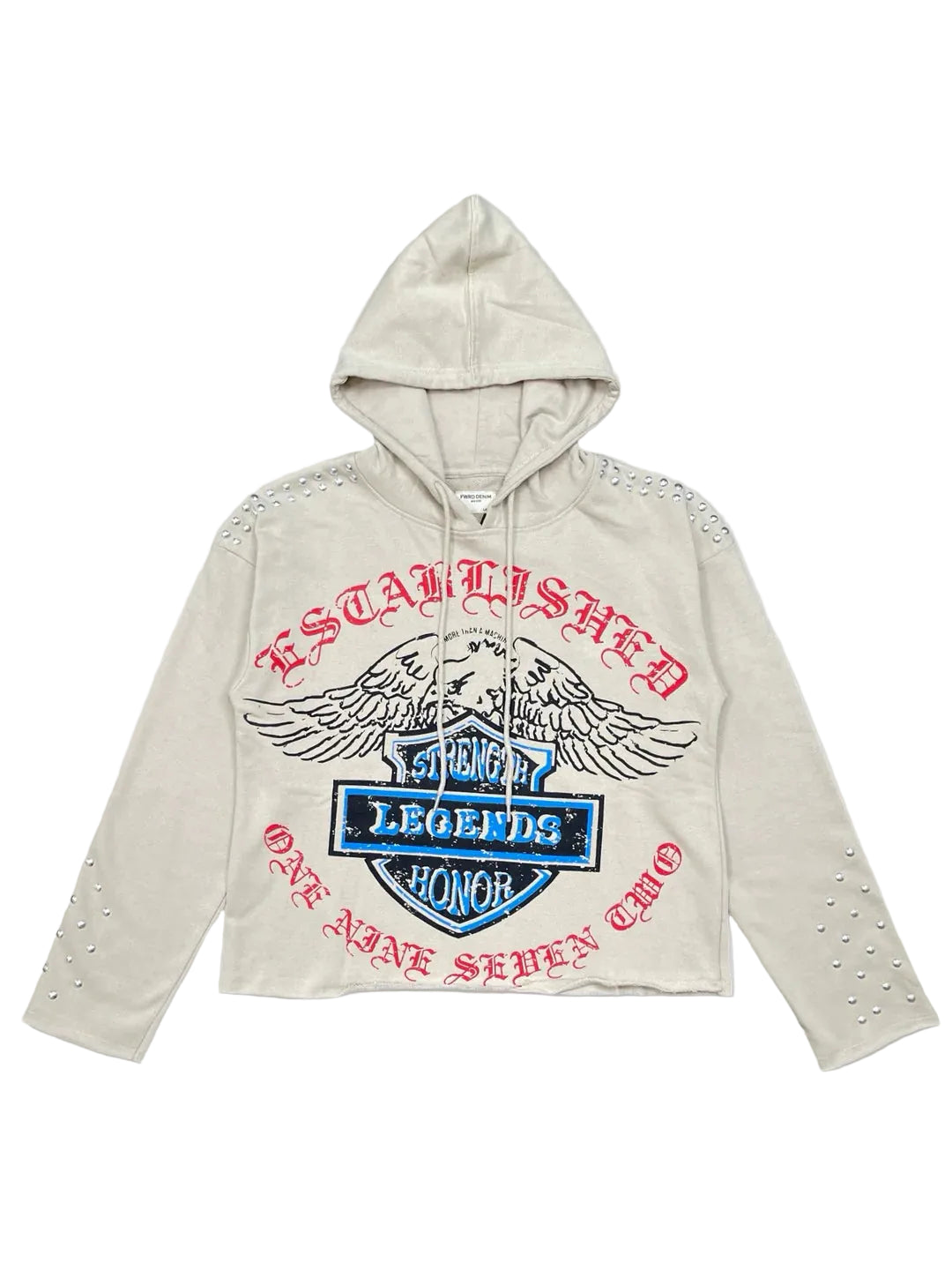 The ESTABLISHED The Studded F/T Hoodie delivers a bold mix of comfort and edge. Designed with a premium full‑torso layout, it features metal stud detailing that adds instant attitude and standout shine. The soft, durable fabric keeps the fit relaxed and wearable, while the studded accents give it a street‑ready, elevated look. Perfect for pairing with stacked denim, cargos, or any fit that needs a strong finishing piece.